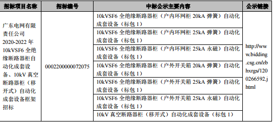 近日,南方電網(wǎng)公司在其電子商務(wù)平臺(tái)公示了“廣東電網(wǎng)有限責(zé)任公司2020-2022年10kVSF6全絕緣斷路器柜自動(dòng)化成套設(shè)備、10kV真空斷路器柜(移開式)自動(dòng)化成套設(shè)備框架招標(biāo)結(jié)果”,北京科銳為上述項(xiàng)目中標(biāo)候選人。根據(jù)公司中標(biāo)數(shù)量及報(bào)價(jià)測(cè)算,上述項(xiàng)目中標(biāo)金額約為3.78億元,占公司2019年經(jīng)審計(jì)營(yíng)業(yè)收入的15.62%。