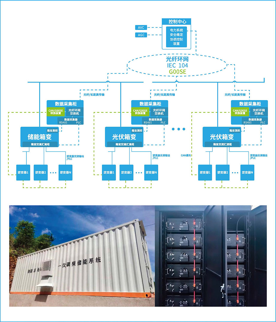 利用該系統(tǒng),單機(jī)或加裝獨(dú)立控制裝置,新能源發(fā)電廠(chǎng)可完成有功-頻率下垂特性控制,使其在并網(wǎng)點(diǎn)具備參與電網(wǎng)一次調(diào)頻響應(yīng)能力??砂凑招履茉唇涣鱾?cè)額定功率的10%~20%,儲(chǔ)能時(shí)長(zhǎng)按照1h~2h進(jìn)行配置。本系統(tǒng)可控制分布式無(wú)功輸出,能滿(mǎn)足在30ms對(duì)AVC/AGC調(diào)度指令的響應(yīng),替代集中式的SVG設(shè)備。
